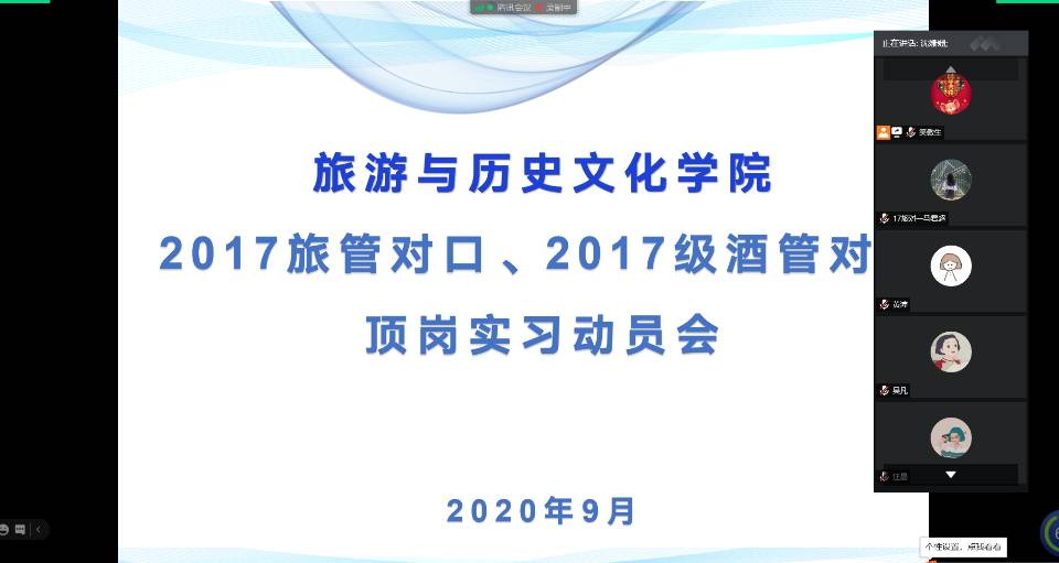 为避免人员流动、聚集带来的疫情风险,公司要求实习单位采取线上与员工进行双选,并于9月14日下午通过腾讯会议召开线上顶岗实习动员会。公司领导,指导老师及157名员工参加了动员会。动员会上旅管教研室主任沈姗姗老师详细介绍了顶岗实习的重要意义,计划安排及考核要求;桂百桢副书记强调了实习纪律及安全;胡文海经理重点强调了实习期间疫情防控要求及注意事项,要求同学们在做好常态化疫情防控的前提下圆满完成实习任务,答好疫情防控和顶岗实习两份答卷。