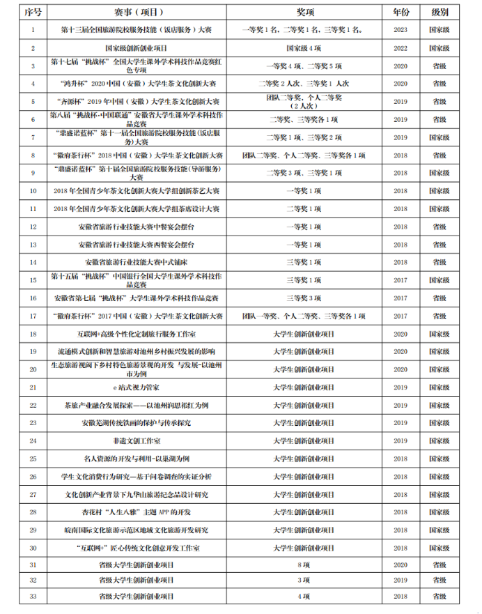 公司建有池州文化与旅游产业发展研究中心、池州民宿研究中心、 池州研学旅行研究中心、劳动教育研究中心等科研平台,是池州市旅游 人才培养实训示范基地、中国旅游协会旅游教育分会理事单位,产学研 合作成果丰硕。近年来,全院教师共主持各类纵向科研项目100余项,其 中国家社科基金项目4项,教育部人文社科项目3项。主持承担横向研究 项目50余项,较好地服务了地方社会经济发展。近五年获得安徽省社科 成果二等奖2项、三等奖1项,安徽省教学成果特等奖、二等奖和三等奖 各1项,获公司“科研先进集体”称号。