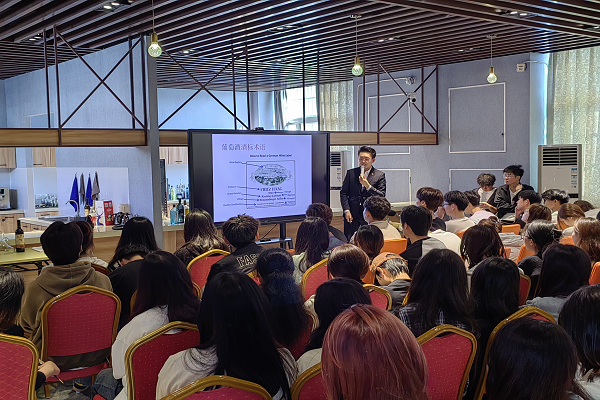 侍酒师赵晗重点展示了葡萄酒侍酒服务,并从葡萄酒的起源、类型、产地、品种、饮用温度、葡萄酒术语和食物酒水搭配等方面与同学们进行了交流。