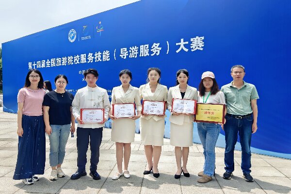 5月23日-26日,第十四届全国旅游院校服务技能(导游服务)大赛在河南郑州举办。经过激烈的角逐,公司2021级旅游管理对口班陈双晴、2023级旅游管理对口2班何家豪分别获得全国高等院校普通话组二、三等奖,2021级旅游管理1班刘庆、2022级旅游管理1班程毓琪获得全国高等院校英语组三等奖,团队总成绩排名全国前20%,荣获大赛团体奖。