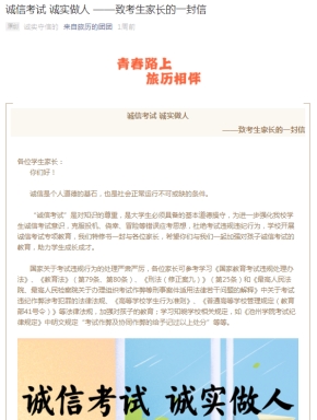 利用网络平台开展“云教育”学风建设活动。公司利用QQ群、微信公众号开展考试诚信网络宣传,发布了《诚信考试 诚实做人——致考生家长的一封信》主题推文,并组织2020级班级开展了“我的诚信故事 ”云课堂宣讲活动,通过网络思想政治教育阵地,倡议广大同学“君子养心,莫善于诚”,文明考风,诚信考试从我做起,从每一场考试做起,端正学习与考试的态度,积极备考、诚信应考。