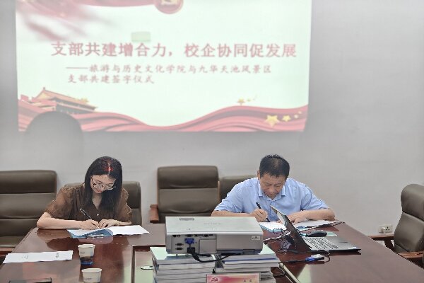 签字仪式上,公司教工第三党支部、员工第一党支部、九华天池风景区党支部书记分别介绍了各自支部的概况、党建工作特色,并表达了共同的期望:借此次党建结对共建之东风,在省级校企合作实践教育基地、旅游新媒体运营微专业建设等关键领域,展开深入持久的合作,实现双方优势互补、资源共享、合作共赢。