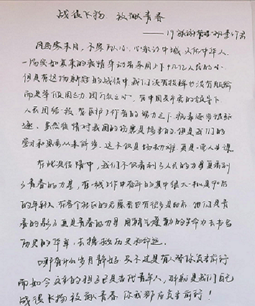 各班团支部通过线上平台多种形式组织广大团员青年观看了各地医护人员驰援武汉、倾力抗疫的视频,直观感受中国速度、中国力量和中国精神;了解各国在这场对抗疫情的不同做法,切身感受中国特色社会主义制度的优势。公司广大团员青年积极参与此次主题团日活动,分享身边志愿者的感人故事,并通过手写小作文、制作PPT和微视频等形式,在一笔一划中体悟生命的真谛,在一帧帧的画面中感悟属于新青年的责任与担当,传递青年的蓬勃生机。